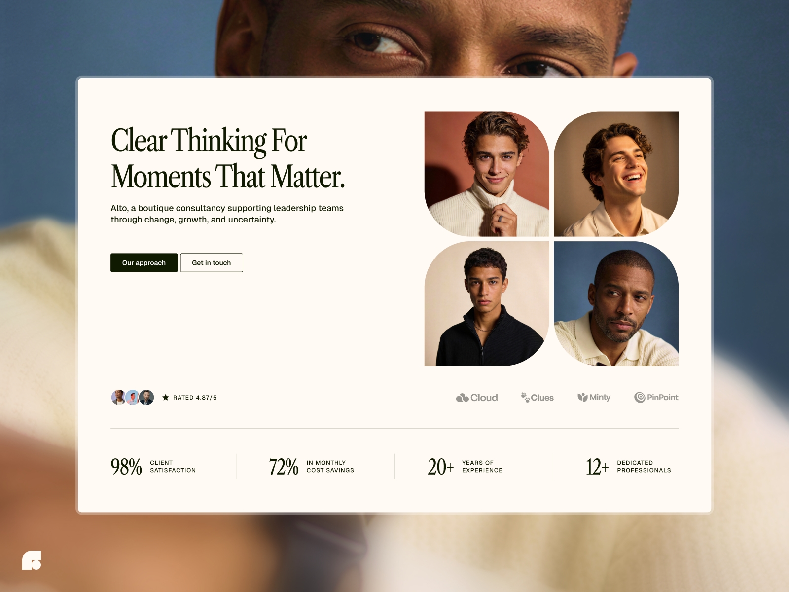 Alto is a thoughtfully designed Framer template for boutique consultancies and businesses. Every layout and interaction is carefully considered to help you tell a credible story, build trust quietly, and present your work with confidence.