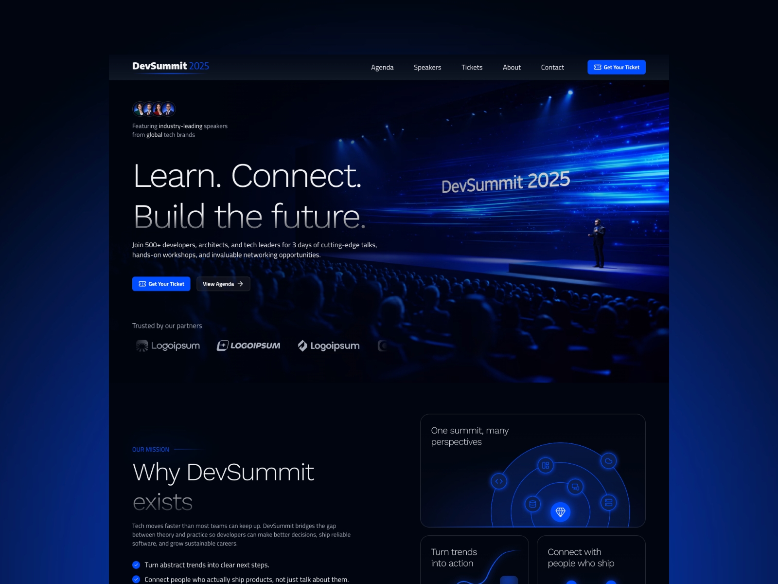 A modern, high-end event and conference website template for tech summits, meetups, and professional conferences. Featuring speaker pages, schedules, ticket sections, and conversion-focused design.