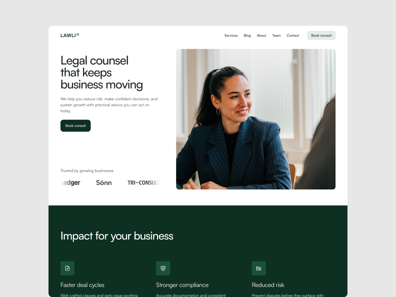 Lawli is a Framer template for law firms and legal consultants. Clean design, clear structure, and ready pages for services, team, and contact. Built to help clients trust and reach you easily.
