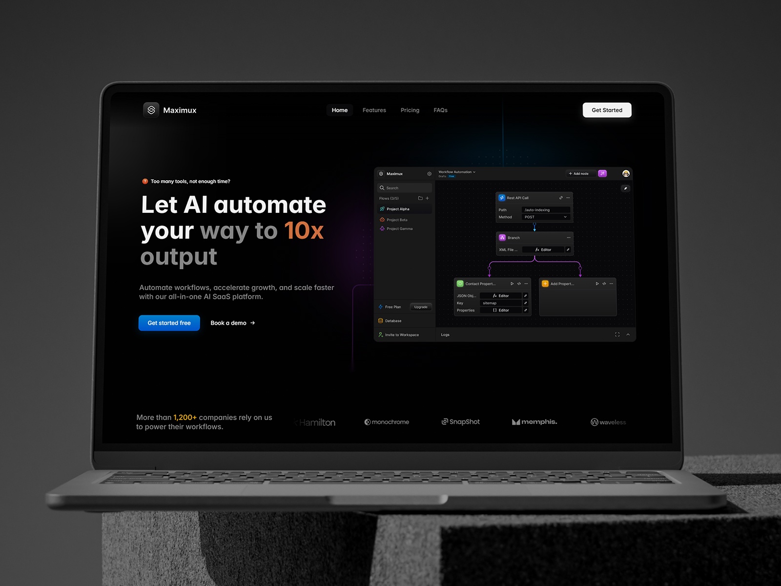 Maximux is a modern Framer template built for AI-powered SaaS platforms, workflow automation tools, and machine learning software. Its dark, bold design creates a strong first impression while the conversion-focused layout directs users toward signups and product engagement. Subtle animations add a polished feel without slowing performance, keeping the experience clean and professional.
