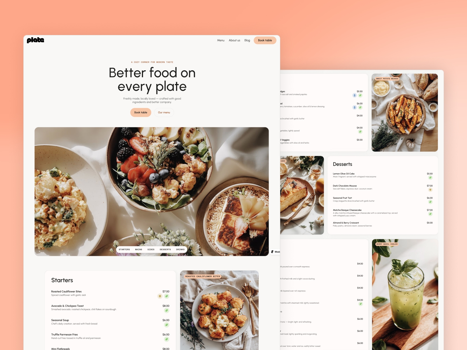 Plate is a Framer template optimized for restaurants and cafés. With a clean layout, menu section, and CMS-powered blog, Plate makes it easy to showcase your food, atmosphere, and story beautifully.