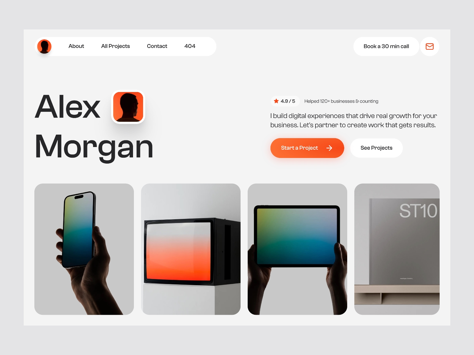 A clear, minimal structure for Home, About, Contact, All Projects, Projects Details, Text Pages & 404.