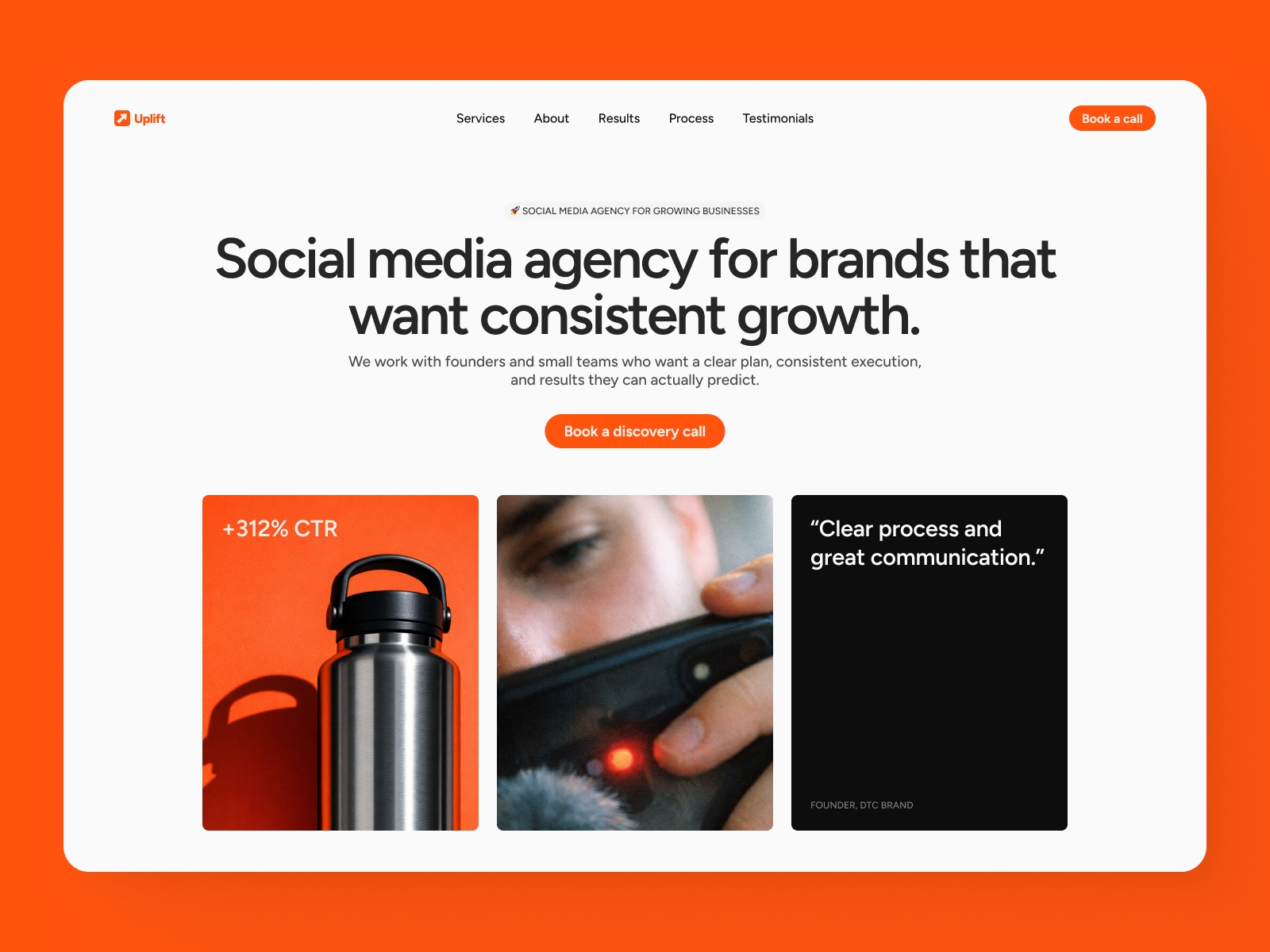 Uplift is a Framer template built for social media and performance marketing agencies. Structured sections for case studies, services, process, and clear calls to action — designed to help you present results and generate discovery calls.